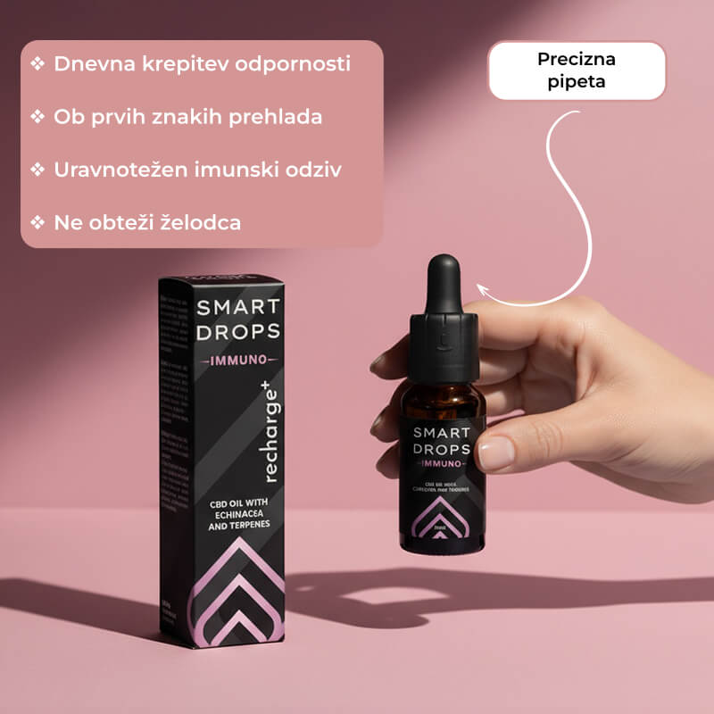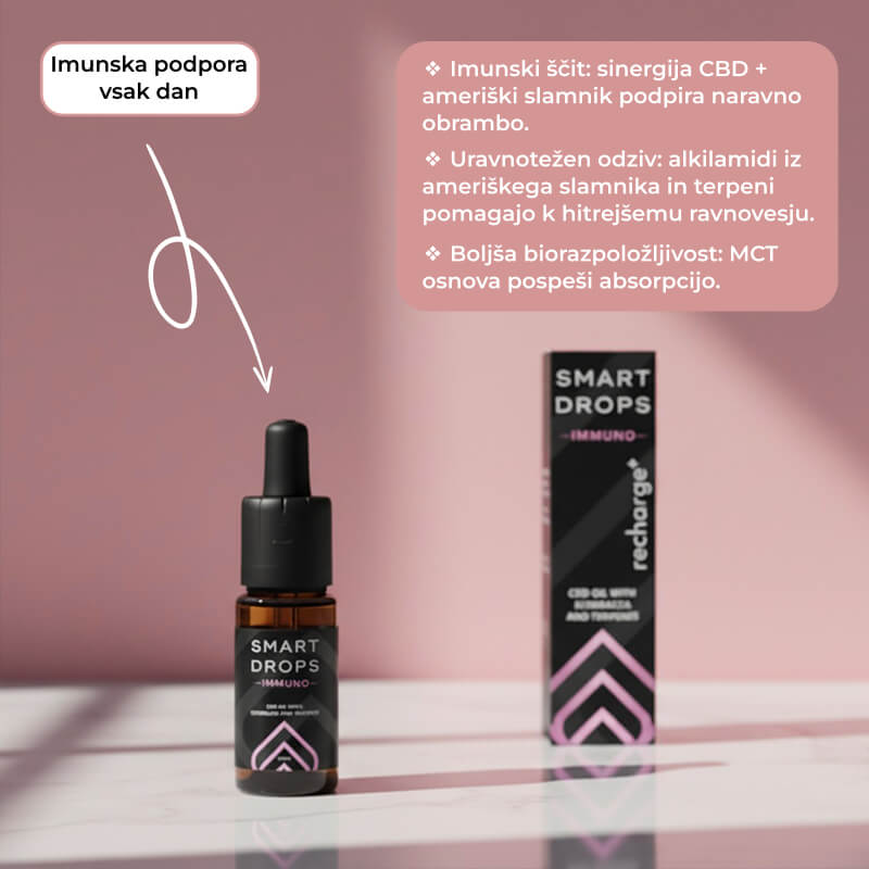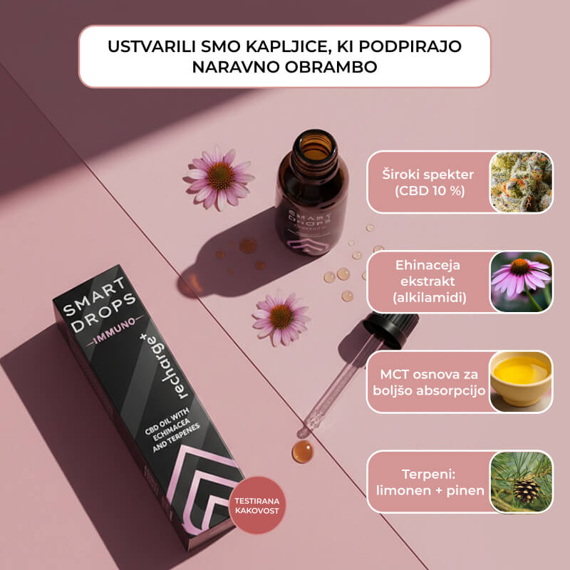 Immuno Drops so skrbno razvite CBD kapljice za vsakodnevno podporo imunskemu sistemu in splošni vitalnosti. Njihova napredna formulacija združuje izvleček ameriškega slamnika, terpene in lahko nosilno olje MCT, ki skupaj pomagajo telesu ohraniti ravnovesje in naravno obrambo.