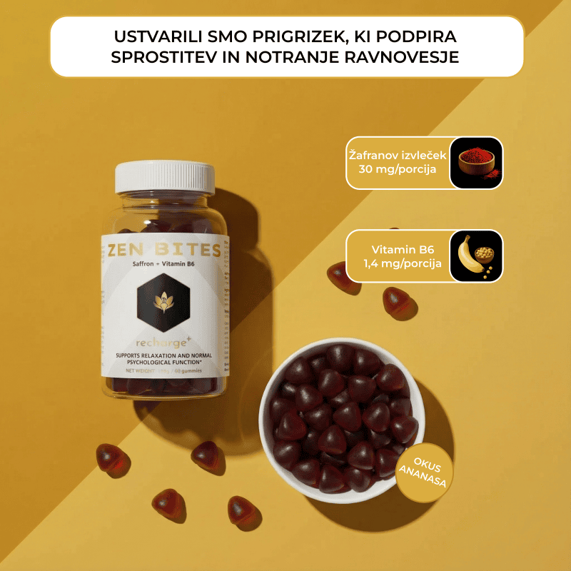 Zen Bites zdruzuje Safr'Inside in vitamin B6 v ciljani formuli, ki podpira razpolozenje, pomaga pri sprostitvi in prispeva k psiholoskemu ravnovesju.